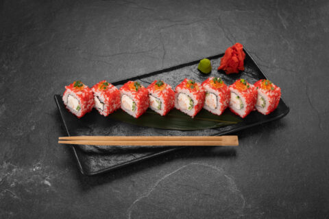 Akajiro Sushi is a vibrant and flavorful sushi roll that perfectly balances creaminess, spice, and freshness. It features tender imitation crab, crisp cucumber, and a smooth cream cheese sauce for a rich yet refreshing bite. Topped with bold red masago and a drizzle of spicy sauce, this roll delivers a delightful pop of texture and a subtle kick, making it a delicious choice for those who enjoy a fusion of creamy and spicy flavors.