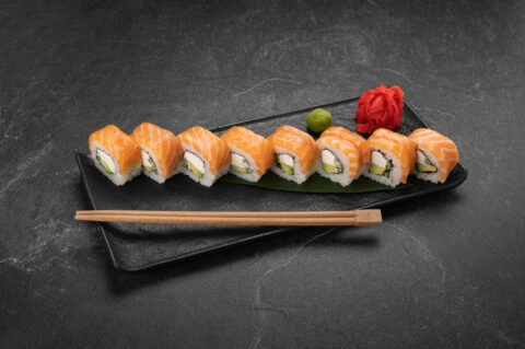 Refreshing Lemon & Salmon Roll is a zesty and creamy sushi roll that highlights the delicate flavor of fresh salmon. It features smooth cream cheese and buttery avocado for a rich texture. Thin slices of lemon and a sprinkle of lemon powder add a bright citrusy kick, while yuzu sauce enhances the roll with a refreshing umami depth. This roll offers a perfect balance of creaminess, tanginess, and fresh seafood flavors.