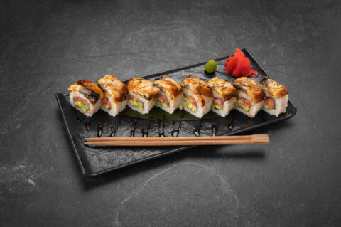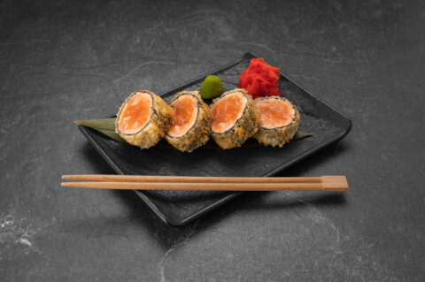 Usubeni Maki is a bold and flavorful sushi roll that combines a variety of seafood for a rich, umami-packed bite. It features a creamy shrimp and crab mix, buttery avocado, and torched salmon. A layer of spicy tuna adds a kick, while black masago provides a subtle crunch and a striking visual contrast. This roll is a perfect balance of spice, creaminess, and oceanic depth, making it an exciting choice for sushi lovers.